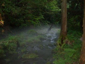 滝と川のあたりだけの空気が冷えていて、霧だっている。