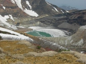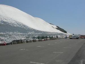 御釜までの有料道路は左右にメートル単位の雪が残っていた。